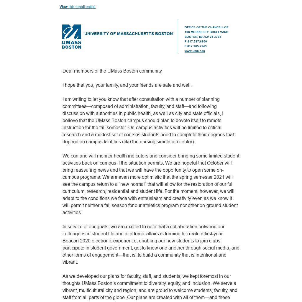 I am writing to let you know that after consultation with a number of planning committees—composed of administration, faculty, and staff—and following discussion with authorities in public health, as well as city and state officials, I believe that the UMass Boston campus should plan to devote itself to remote instruction for the fall semester. On-campus activities will be limited to critical research and a modest set of courses students need to complete their degrees that depend on campus facilities (like the nursing simulation center).