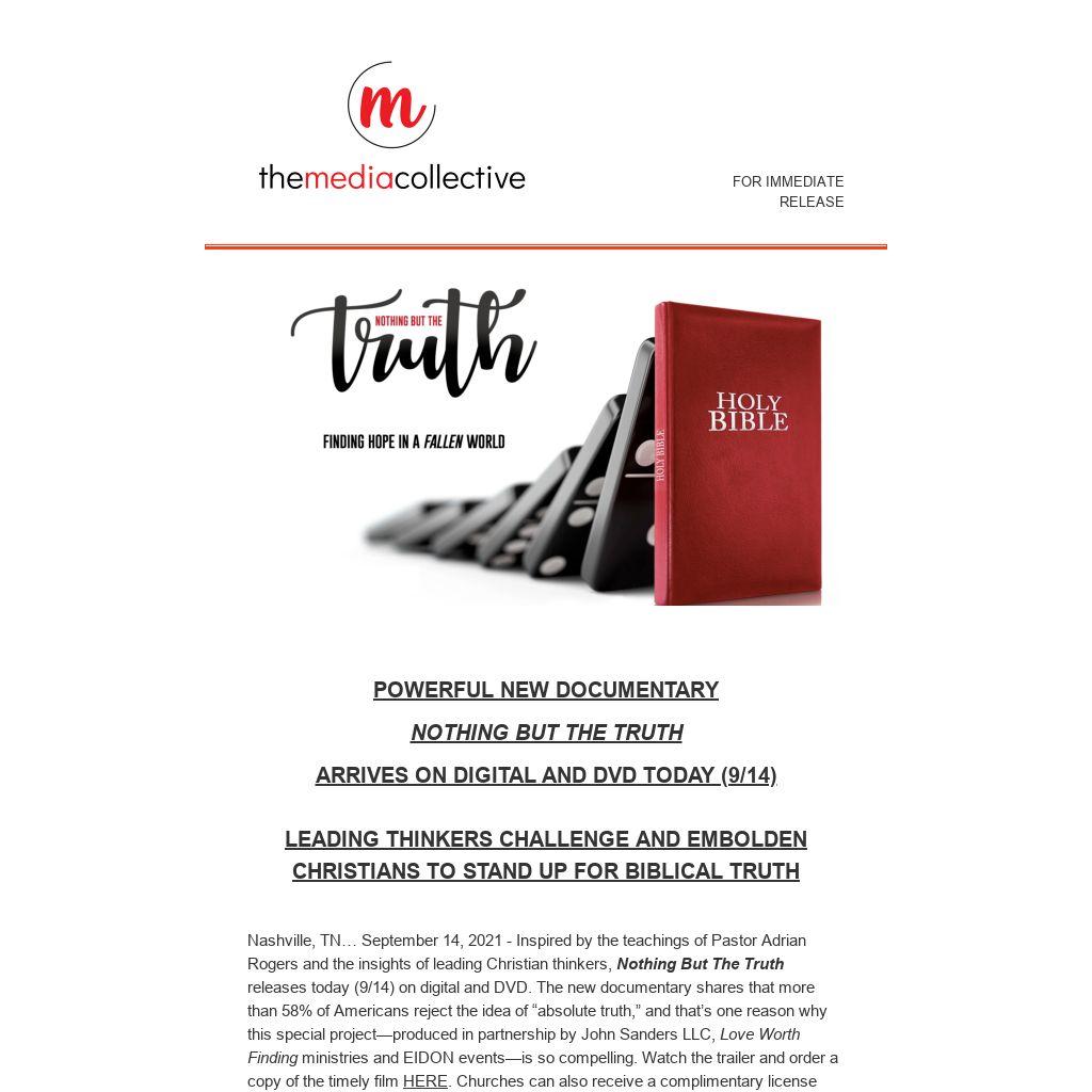 Nashville, TN… September 14, 2021 - Inspired by the teachings of Pastor Adrian Rogers and the insights of leading Christian thinkers, Nothing But The Truth releases today (9/14) on digital and DVD. The new documentary shares that more than 58% of Americans reject the idea of “absolute truth,” and that’s one reason why this special project—produced in partnership by John Sanders LLC, Love Worth Finding ministries and EIDON events—is so compelling. Watch the trailer and order a copy of the timely film HERE. Churches can also receive a complimentary license and free resources, courtesy of Love Worth Finding, to host a screening of Nothing But The Truth at no cost to the host church. More details on the Nothing But The Truth Church Experience are available HERE.