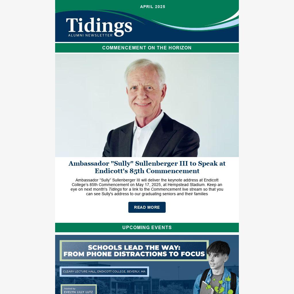 Ambassador “Sully” Sullenberger III will deliver the keynote address at Endicott College’s 85th Commencement on May 17, 2025, at Hempstead Stadium. Keep an eye on next month's Tidings for a link to the Commencement live stream so that you can see Sully's address to our graduating seniors and their families
