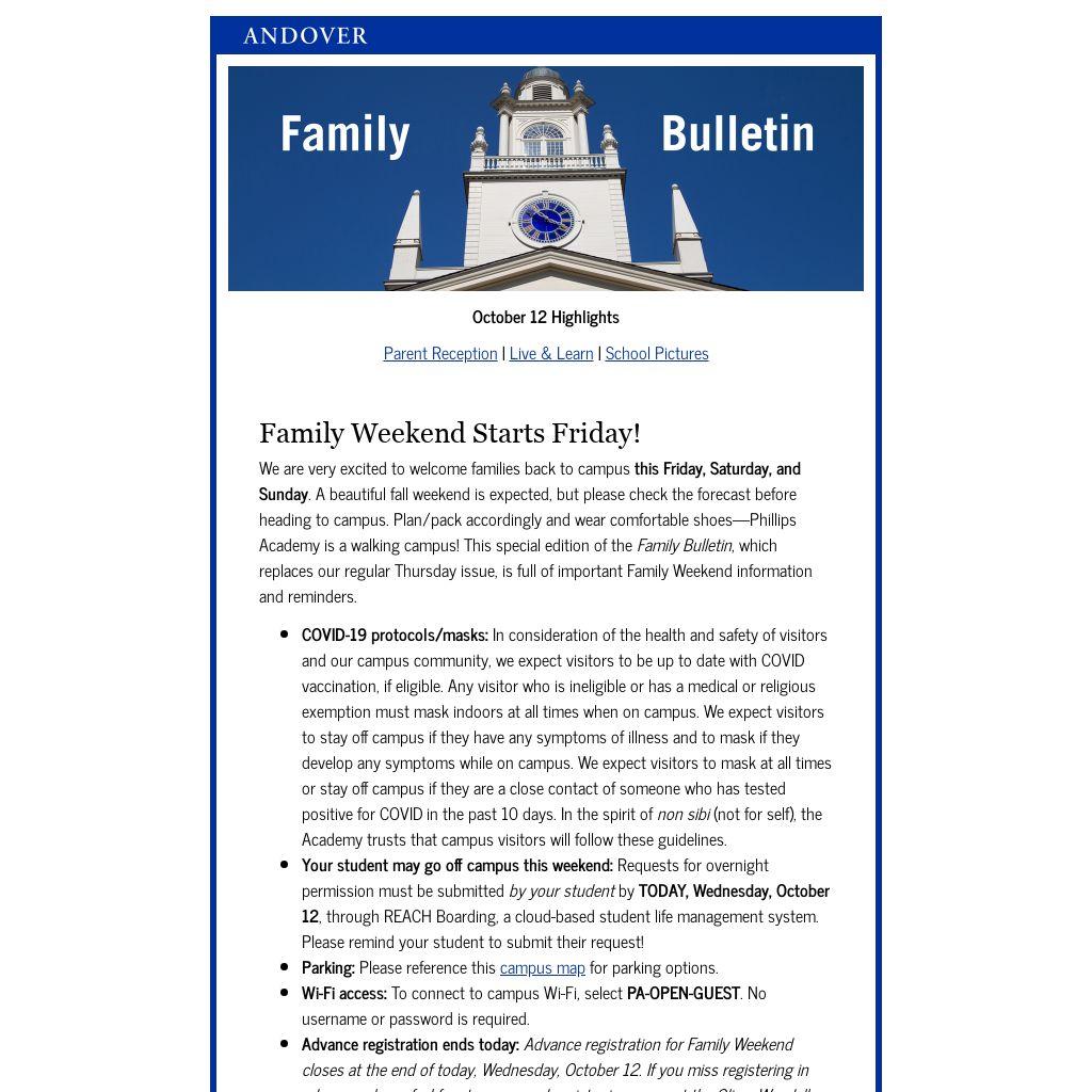 We are very excited to welcome families back to campus this Friday, Saturday, and Sunday. A beautiful fall weekend is expected, but please check the forecast before heading to campus. Plan/pack accordingly and wear comfortable shoes—Phillips Academy is a walking campus! This special edition of the Family Bulletin, which replaces our regular Thursday issue, is full of important Family Weekend information and reminders.