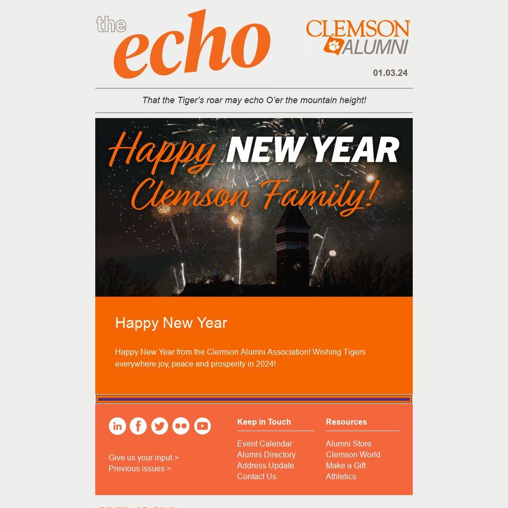 Happy New Year from the Clemson Alumni Association! Wishing Tigers everywhere joy, peace and prosperity in 2024!