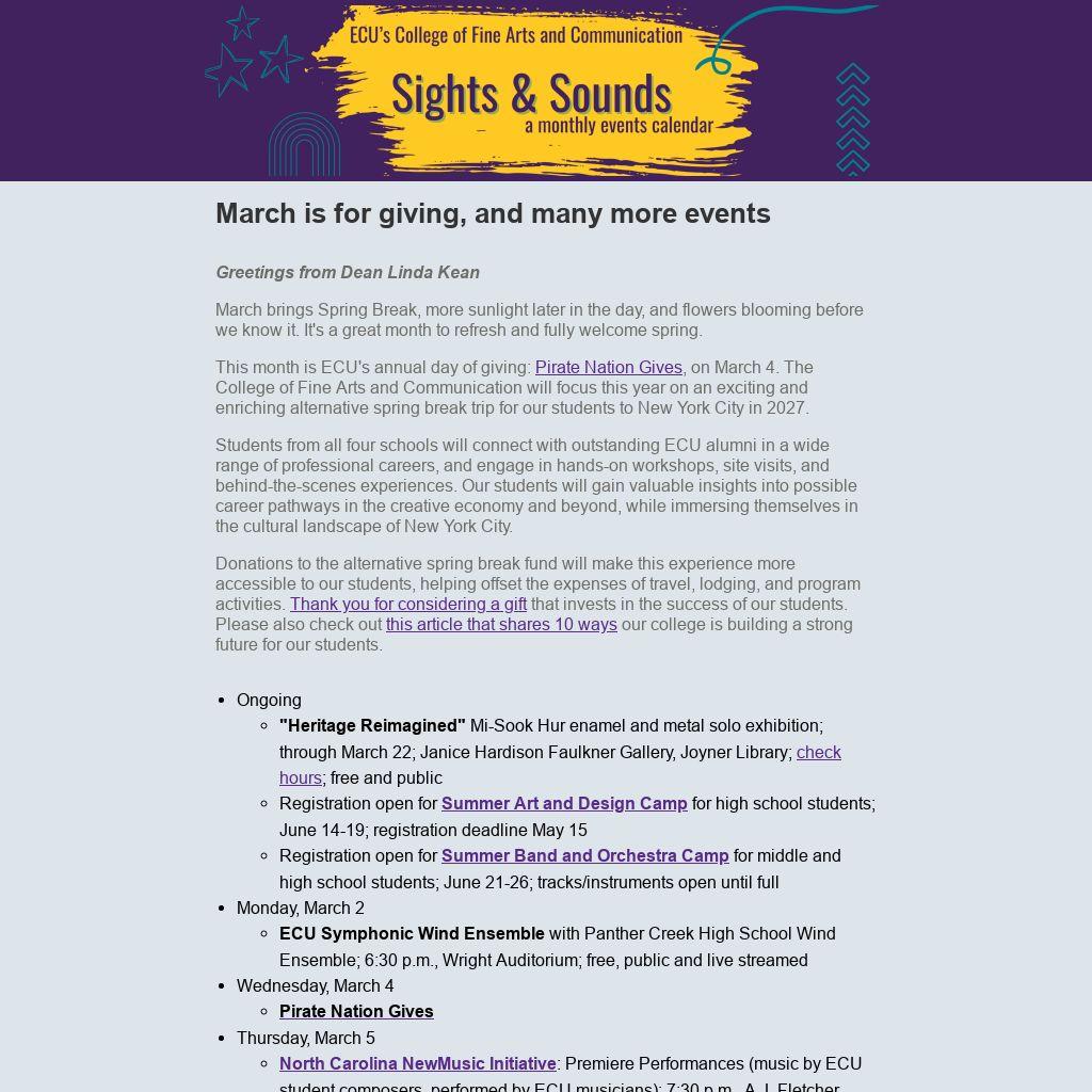 This month is ECU's annual day of giving: Pirate Nation Gives, on March 4. The College of Fine Arts and Communication will focus this year on an exciting and enriching alternative spring break trip for our students to New York City in 2027.
