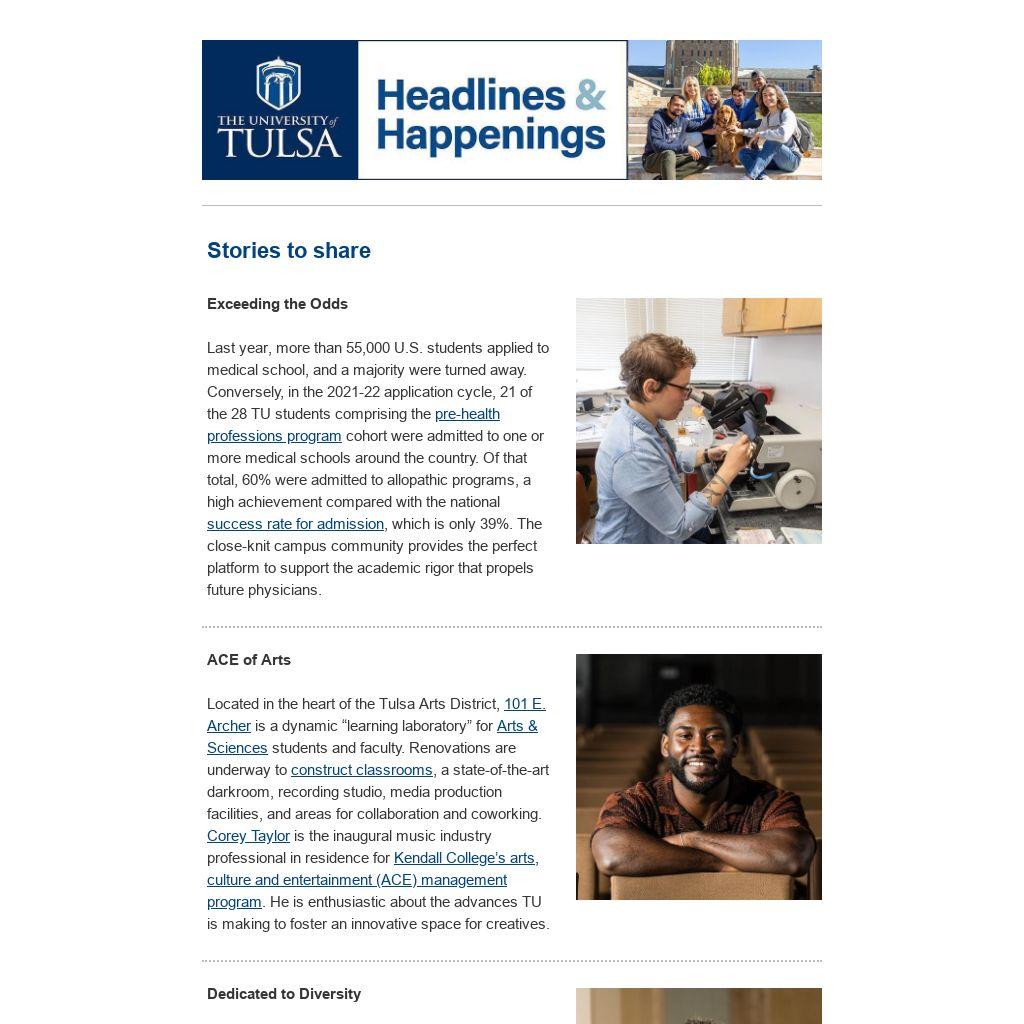 Last year, more than 55,000 U.S. students applied to medical school, and a majority were turned away. Conversely, in the 2021-22 application cycle, 21 of the 28 TU students comprising the pre-health professions program cohort were admitted to one or more medical schools around the country. Of that total, 60% were admitted to allopathic programs, a high achievement compared with the national success rate for admission, which is only 39%. The close-knit campus community provides the perfect platform to support the academic rigor that propels future physicians.