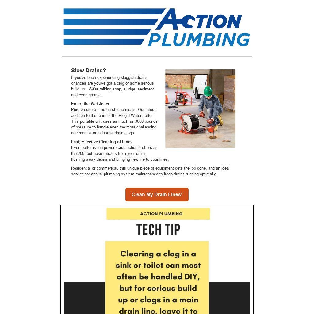 Pure pressure -- no harsh chemicals. Our latest addition to the team is the Ridgid Water Jetter. This portable unit uses as much as 3000 pounds of pressure to handle even the most challenging commercial or industrial drain clogs.