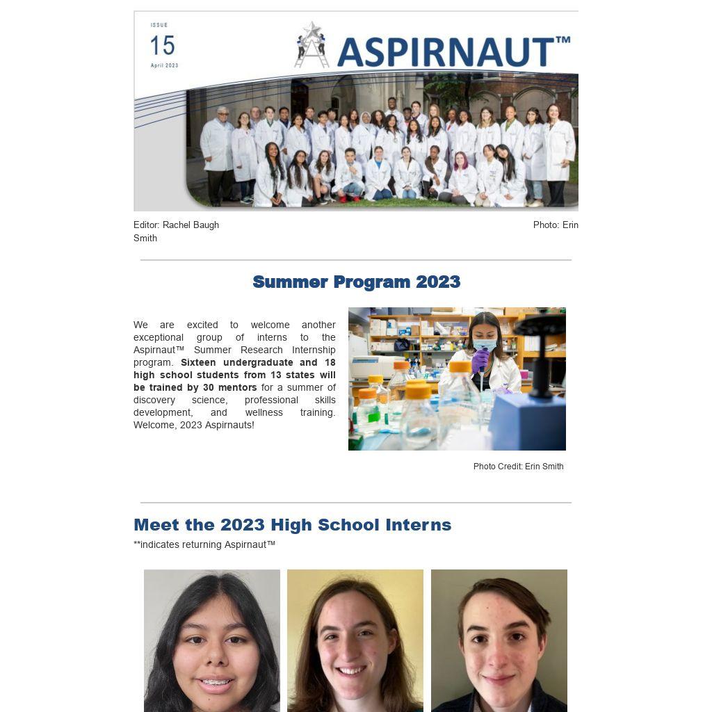 We are excited to welcome another exceptional group of interns to the Aspirnaut™ Summer Research Internship program. Sixteen undergraduate and 18 high school students from 13 states will be trained by 30 mentors for a summer of discovery science, professional skills development, and wellness training. Welcome, 2023 Aspirnauts!