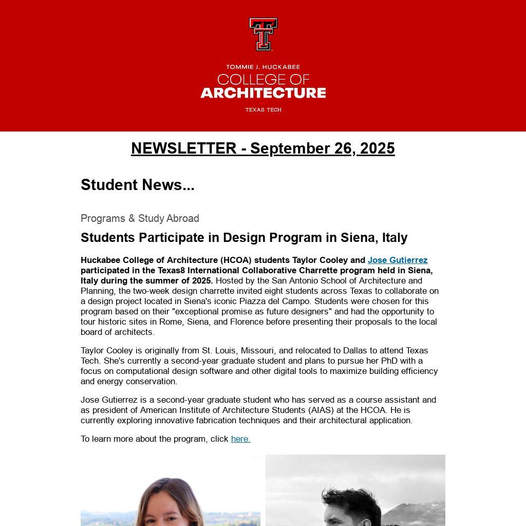 Huckabee College of Architecture (HCOA) students Taylor Cooley and Jose Gutierrez participated in the Texas8 International Collaborative Charrette program held in Siena, Italy during the summer of 2025. Hosted by the San Antonio School of Architecture and Planning, the two-week design charrette invited eight students across Texas to collaborate on a design project located in Siena's iconic Piazza del Campo. Students were chosen for this program based on their "exceptional promise as future designers" and had the opportunity to tour historic sites in Rome, Siena, and Florence before presenting their proposals to the local board of architects.