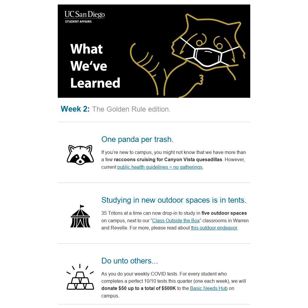 It’s not just the second reference to a beloved NBC show—it’s an integral complement to self care. Tritons, stay together while we’re apart with resources and activities via the Virtual Student Union.