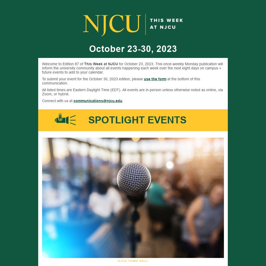Welcome to Edition 87 of This Week at NJCU for October 23, 2023. This once-weekly Monday publication will inform the university community about all events happening each week over the next eight days on campus + future events to add to your calendar.