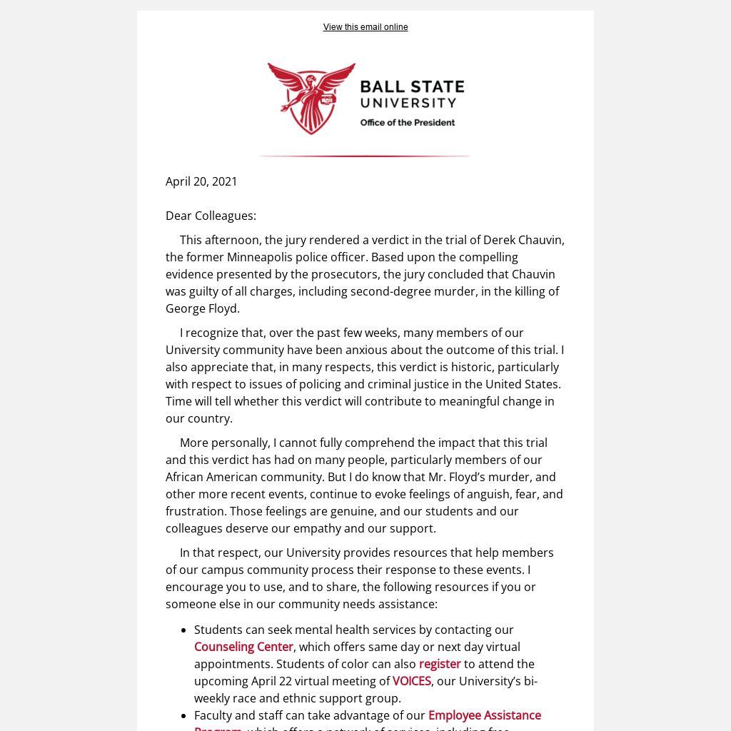 I have also asked my colleagues in the Office of Inclusive Excellence to coordinate with my colleagues in the Division of Student Affairs to provide some additional resources, possibly including virtual events for faculty, staff, and students to continue to discuss the outcome of this criminal trial.