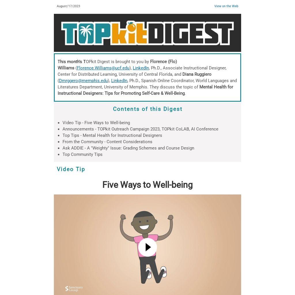 This month’s TOPkit Digest is brought to you by Florence (Flo) Williams (Florence.Williams@ucf.edu), LinkedIn, Ph.D., Associate Instructional Designer, Center for Distributed Learning, University of Central Florida, and Diana Ruggiero (Dmrggero@memphis.edu), LinkedIn, Ph.D., Spanish Online Coordinator, World Languages and Literatures Department, University of Memphis. They discuss the topic of Mental Health for Instructional Designers: Tips for Promoting Self-Care & Well-Being.