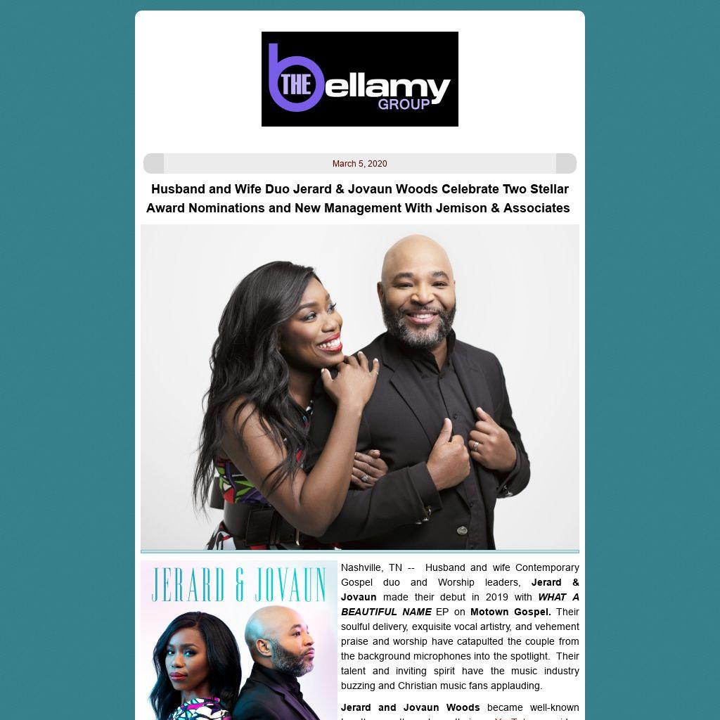 Nashville, TN -- Husband and wife Contemporary Gospel duo and Worship leaders, Jerard & Jovaun made their debut in 2019 with WHAT A BEAUTIFUL NAME EP on Motown Gospel. Their soulful delivery, exquisite vocal artistry, and vehement praise and worship have catapulted the couple from the background microphones into the spotlight. Their talent and inviting spirit have the music industry buzzing and Christian music fans applauding.