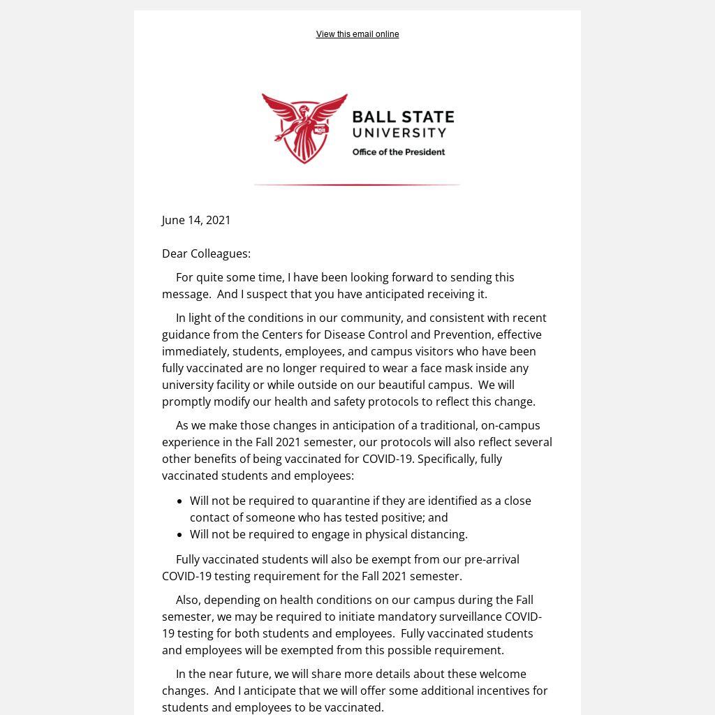 In light of the conditions in our community, and consistent with recent guidance from the Centers for Disease Control and Prevention, effective immediately, students, employees, and campus visitors who have been fully vaccinated are no longer required to wear a face mask inside any university facility or while outside on our beautiful campus. We will promptly modify our health and safety protocols to reflect this change.