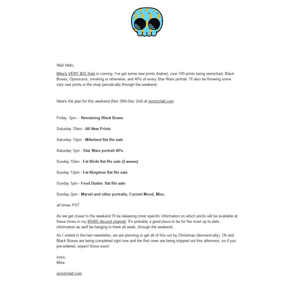 Mike's VERY BIG Sale is coming. I've got some new prints (below), over 100 prints being restocked, Black Boxes, Opossums, smoking or otherwise, and APs of every Star Wars portrait. I'll also be throwing some very rare prints in the shop periodically through the weekend.