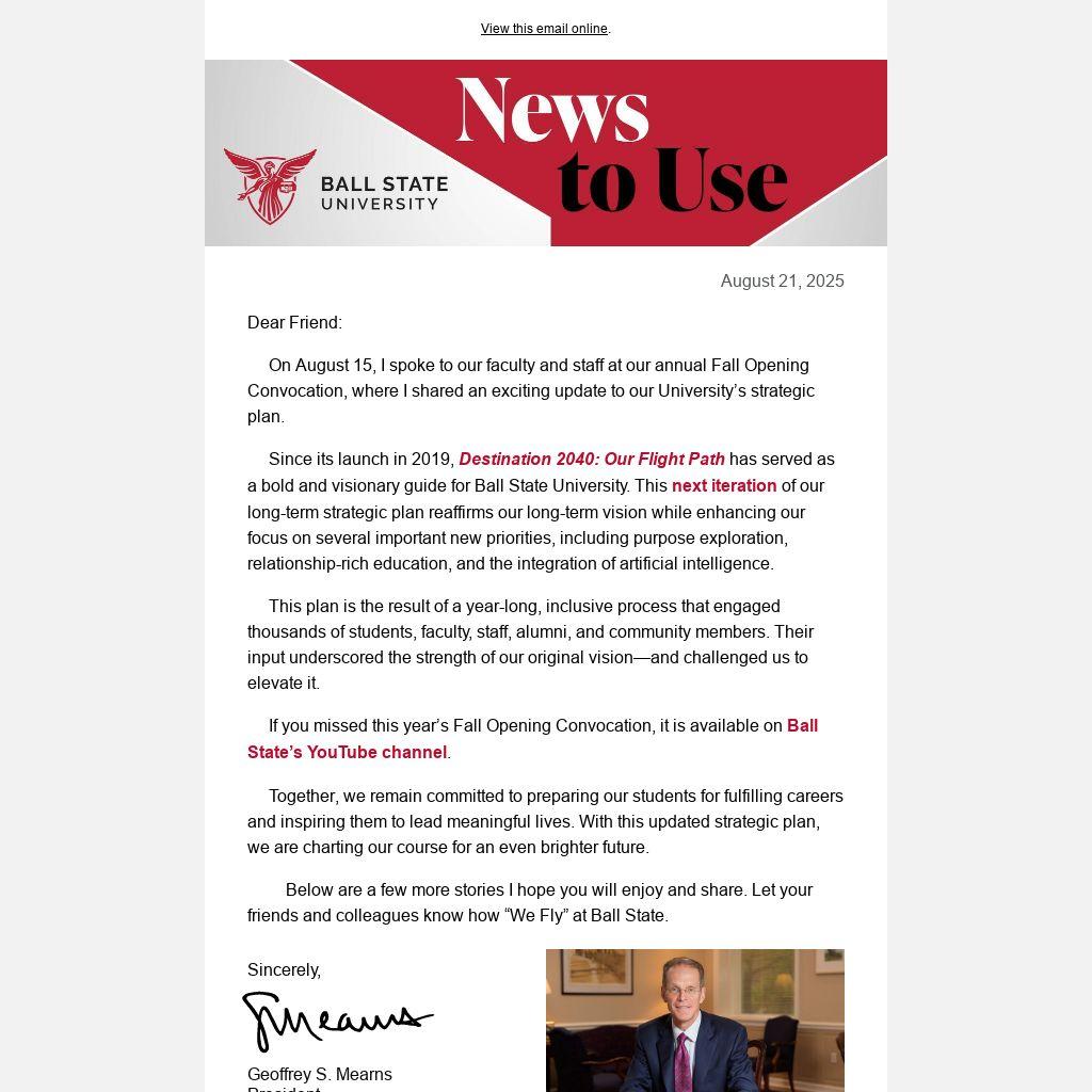 Copyright © 2025 Ball State University, All rights reserved. News and updates from Ball State University leadership are sent to alumni and friends.