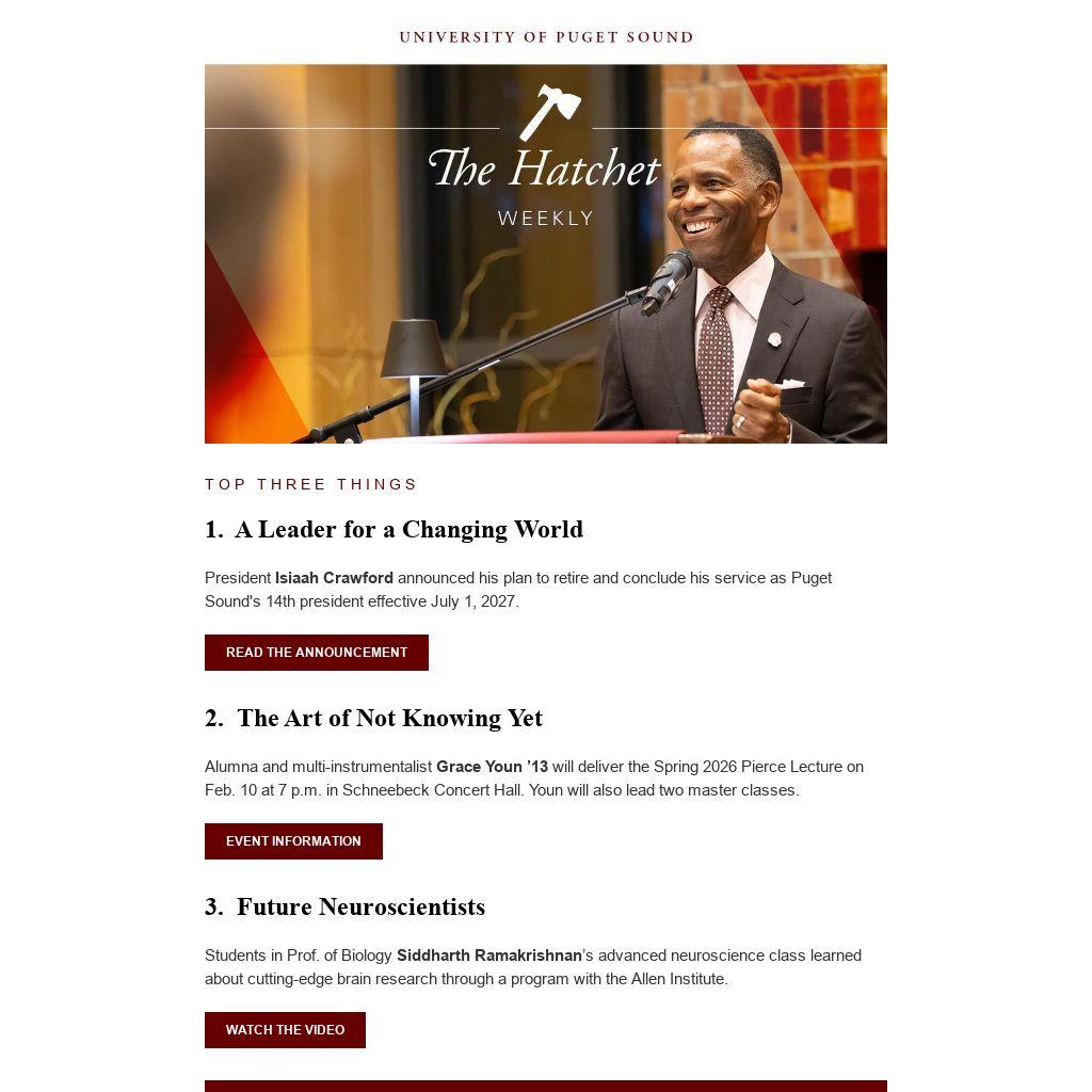 President Isiaah Crawford announced his plan to retire and conclude his service as Puget Sound's 14th president effective July 1, 2027.
