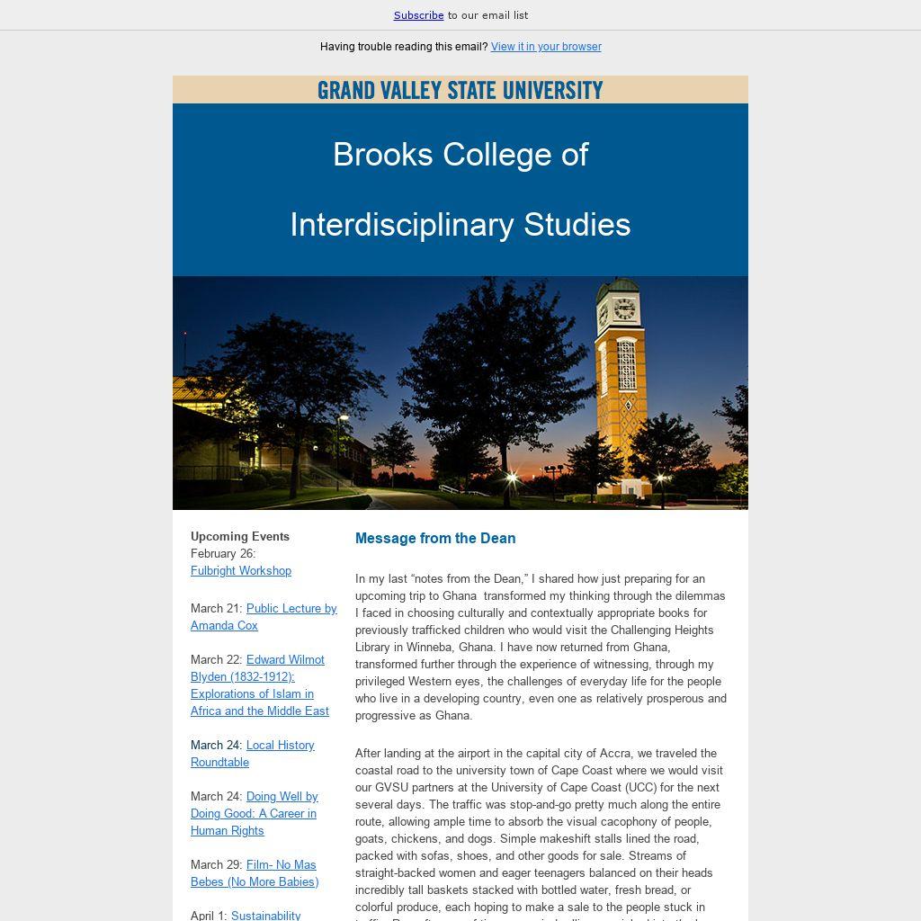 I come back from Ghana transformed with knowledge of Grand Valley’s and the University of Cape Coast’s shared mission and values and our shared belief in the educational value of place-based, project-based learning. I come back with an enhanced appreciation that “fixing” the problems of poverty, public health, and good nutrition are never easy because they are the products of multiple, interacting systems. I return to GVSU with a renewed commitment to foster cooperation and collaboration across our own campus, between the university and our surrounding communities, and with our global partners around the world. Only through understanding, cooperation and collaboration can we genuinely prepare our students to be local and global leaders in their communities and professions.