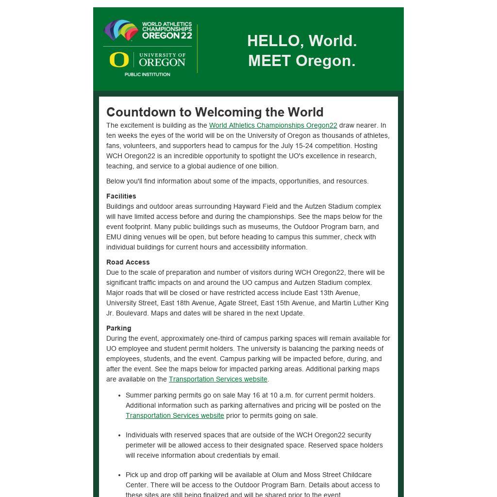Due to the scale of preparation and number of visitors during WCH Oregon22, there will be significant traffic impacts on and around the UO campus and Autzen Stadium complex. Major roads that will be closed or have restricted access include East 13th Avenue, University Street, East 18th Avenue, Agate Street, East 15th Avenue, and Martin Luther King Jr. Boulevard. Maps and dates will be shared in the next Update.