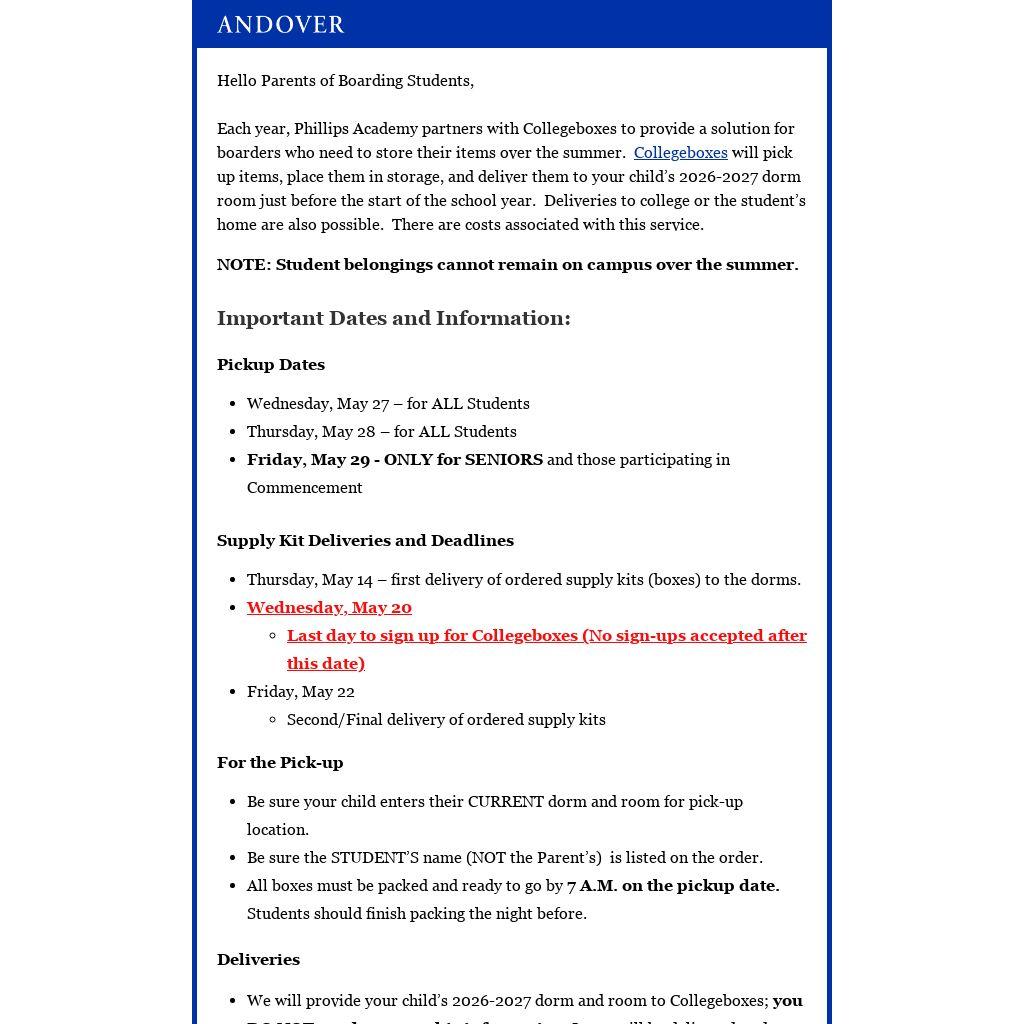 Each year, Phillips Academy partners with Collegeboxes to provide a solution for boarders who need to store their items over the summer. Collegeboxes will pick up items, place them in storage, and deliver them to your child’s 2026-2027 dorm room just before the start of the school year. Deliveries to college or the student’s home are also possible. There are costs associated with this service.