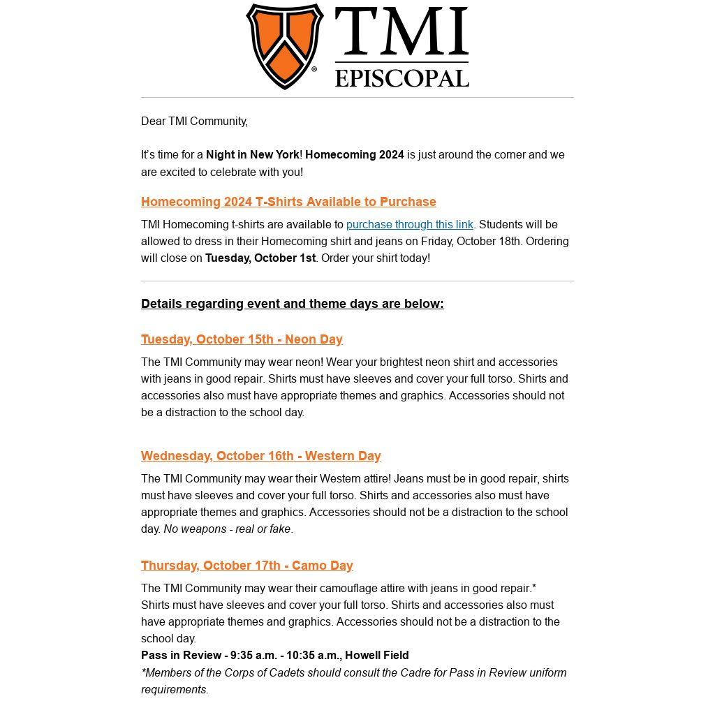 The TMI Community may wear the 2024 Homecoming t-shirt and jeans in good repair or uniform bottoms.