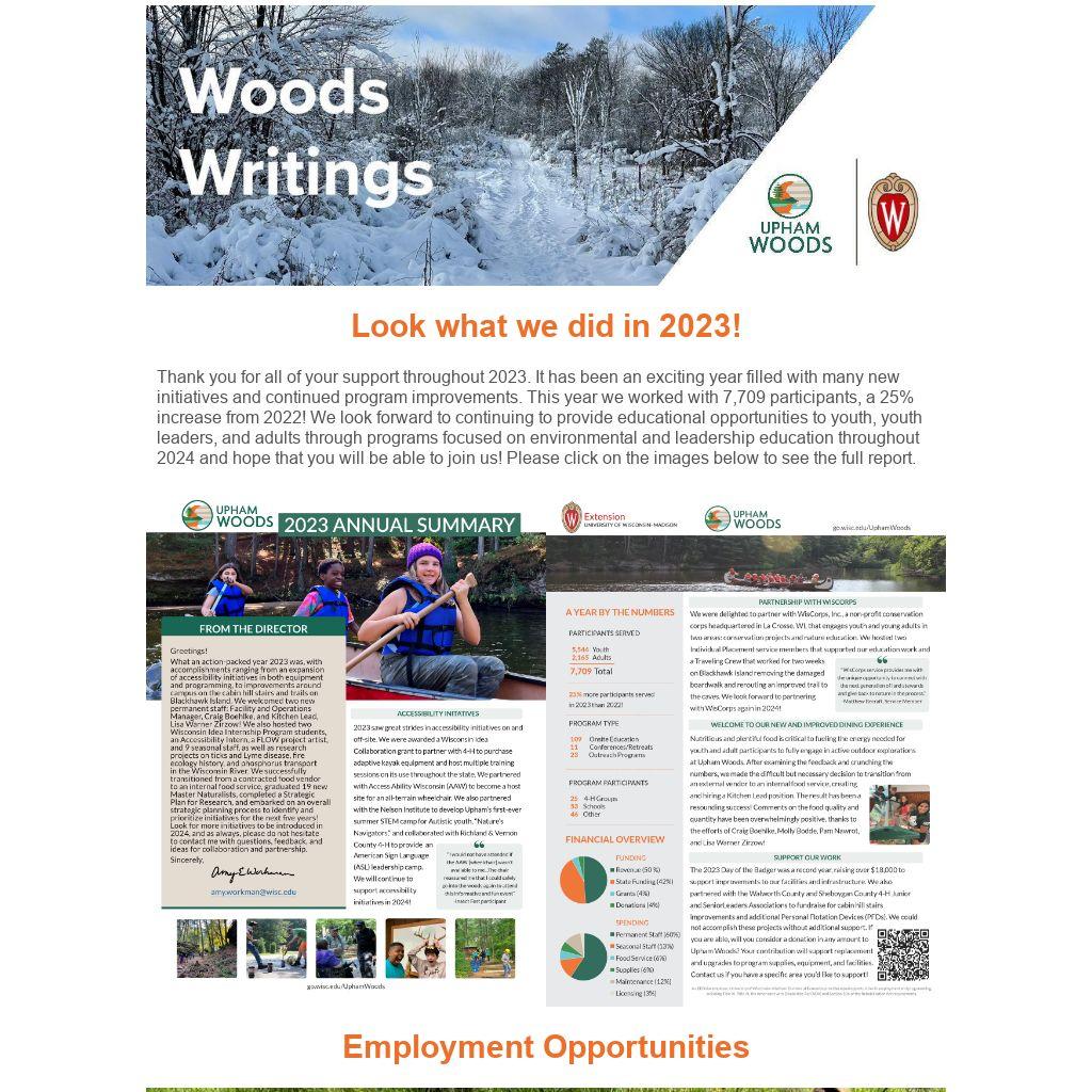 Thank you for all of your support throughout 2023. It has been an exciting year filled with many new initiatives and continued program improvements. This year we worked with 7,709 participants, a 25% increase from 2022! We look forward to continuing to provide educational opportunities to youth, youth leaders, and adults through programs focused on environmental and leadership education throughout 2024 and hope that you will be able to join us! Please click on the images below to see the full report.