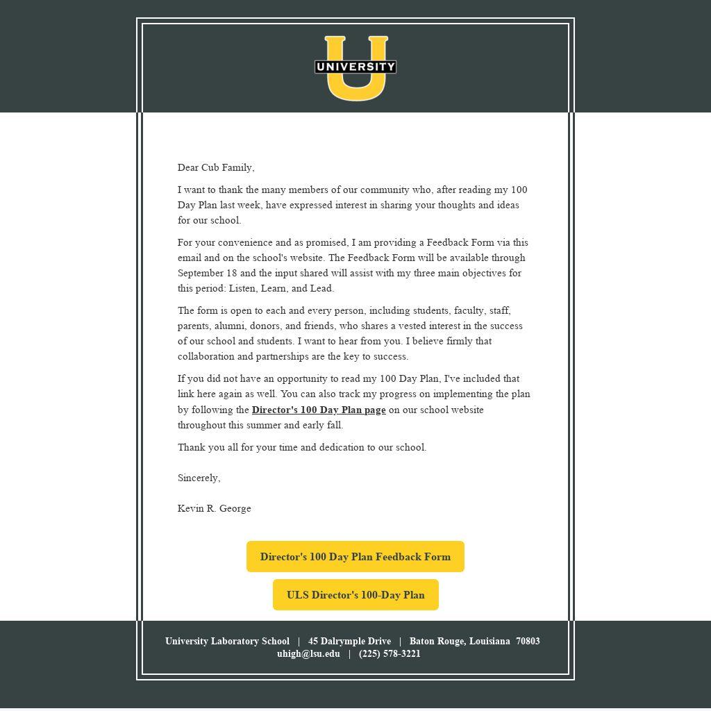 If you did not have an opportunity to read my 100 Day Plan, I've included that link here again as well. You can also track my progress on implementing the plan by following the Director's 100 Day Plan page on our school website throughout this summer and early fall.