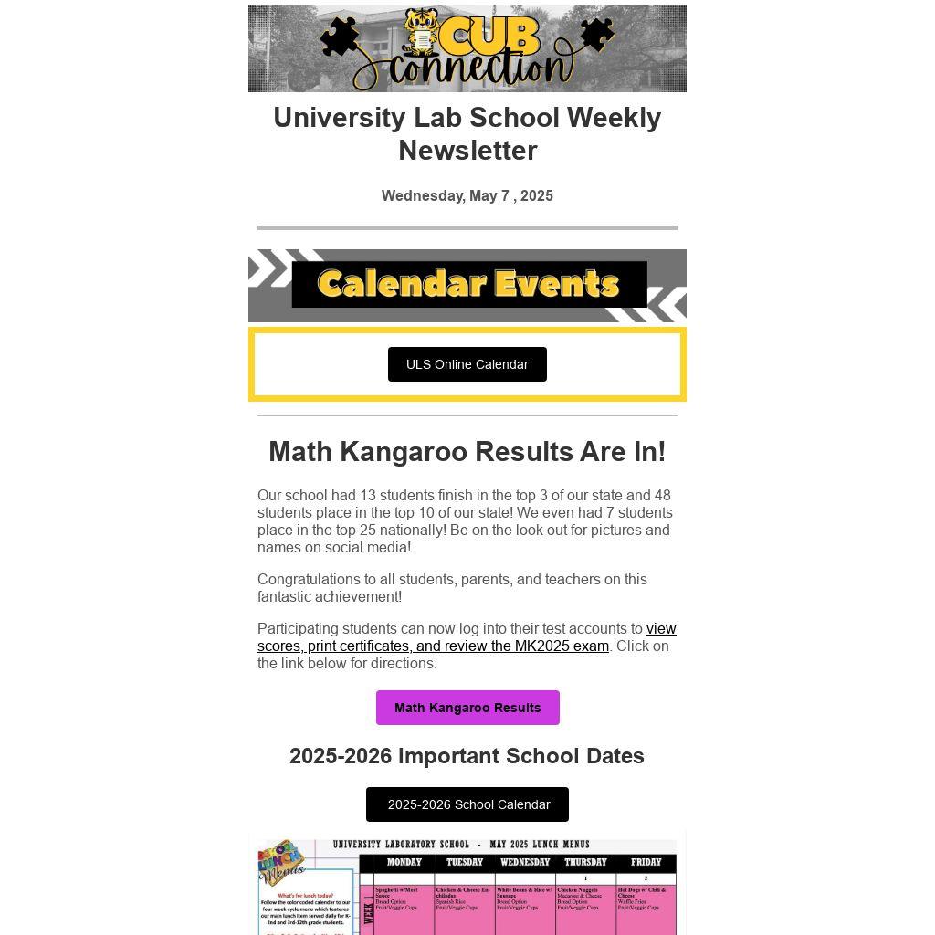 Field Trip T-shirts can be ordered here through the University Cub Shop now through May 31st. Every K-5 child is REQUIRED to have a field trip shirt. 1st round orders are open until May 31st and will be delivered the first week of school. You may order extras and multiple sizes if needed. Please use your child's current homeroom teacher's name during checkout. Parents should coordinate to place one order per child to avoid duplicates and multiple charges. ALL SALES ARE FINAL.