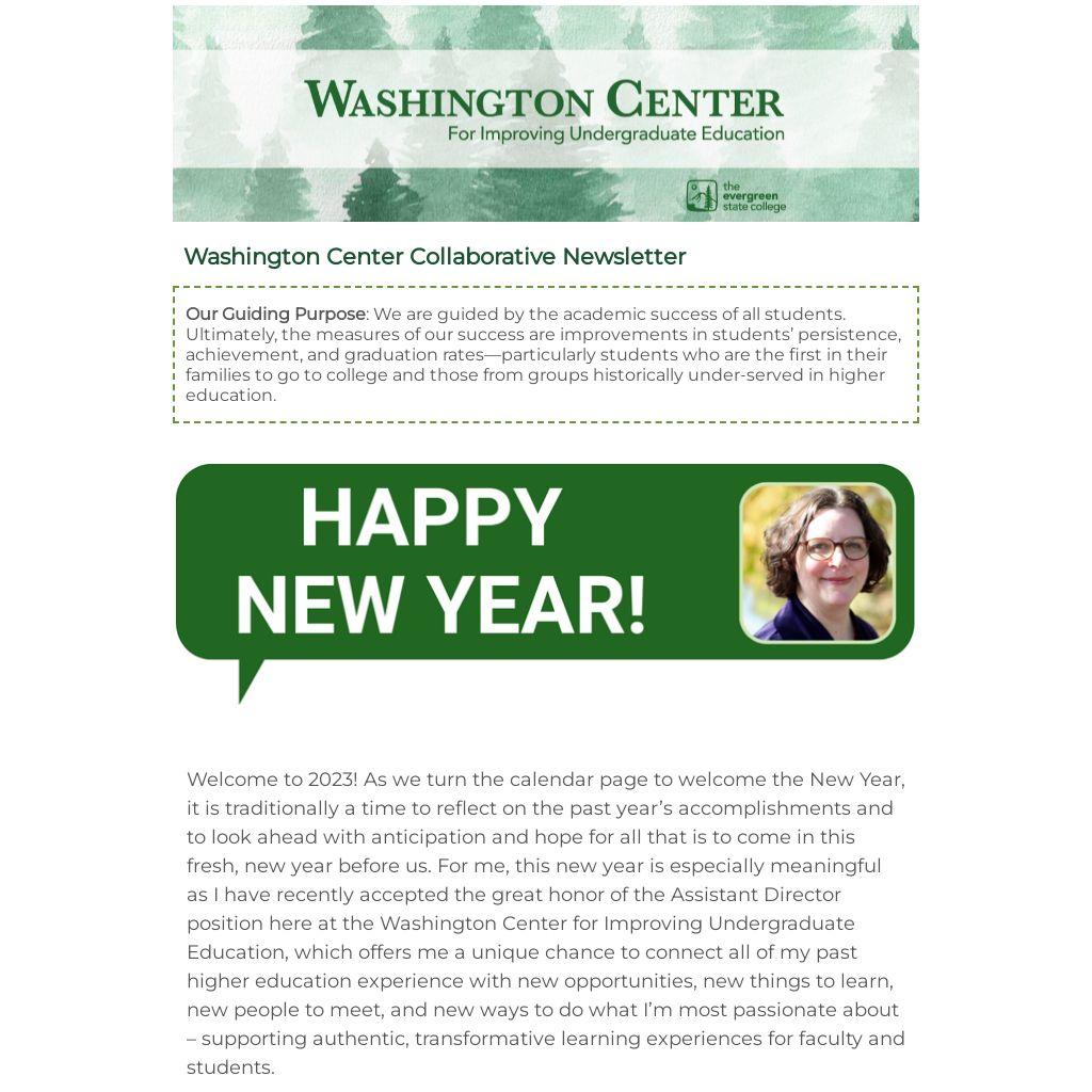 Welcome to 2023! As we turn the calendar page to welcome the New Year, it is traditionally a time to reflect on the past year’s accomplishments and to look ahead with anticipation and hope for all that is to come in this fresh, new year before us. For me, this new year is especially meaningful as I have recently accepted the great honor of the Assistant Director position here at the Washington Center for Improving Undergraduate Education, which offers me a unique chance to connect all of my past higher education experience with new opportunities, new things to learn, new people to meet, and new ways to do what I’m most passionate about – supporting authentic, transformative learning experiences for faculty and students.