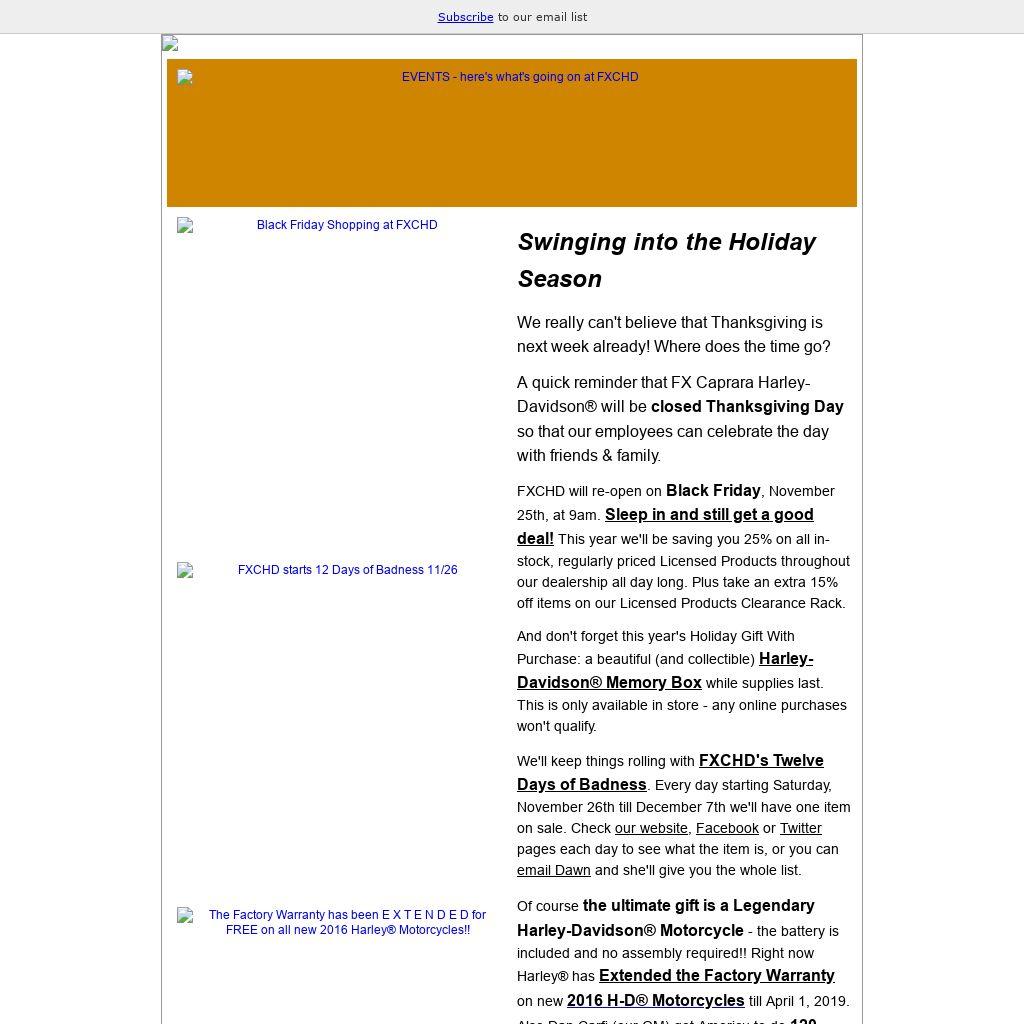 A quick reminder that FX Caprara Harley-Davidson® will be closed Thanksgiving Day so that our employees can celebrate the day with friends & family.