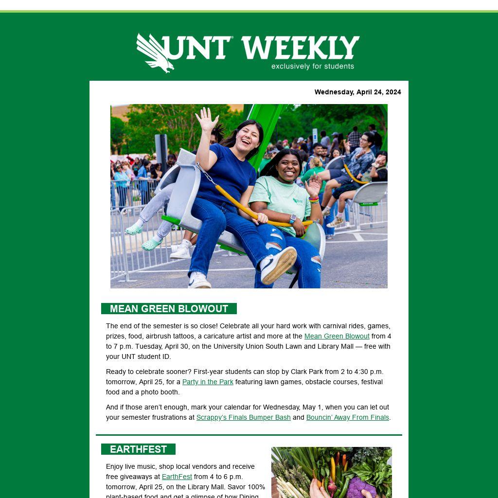 The end of the semester is so close! Celebrate all your hard work with carnival rides, games, prizes, food, airbrush tattoos, a caricature artist and more at the Mean Green Blowout from 4 to 7 p.m. Tuesday, April 30, on the University Union South Lawn and Library Mall — free with your UNT student ID.