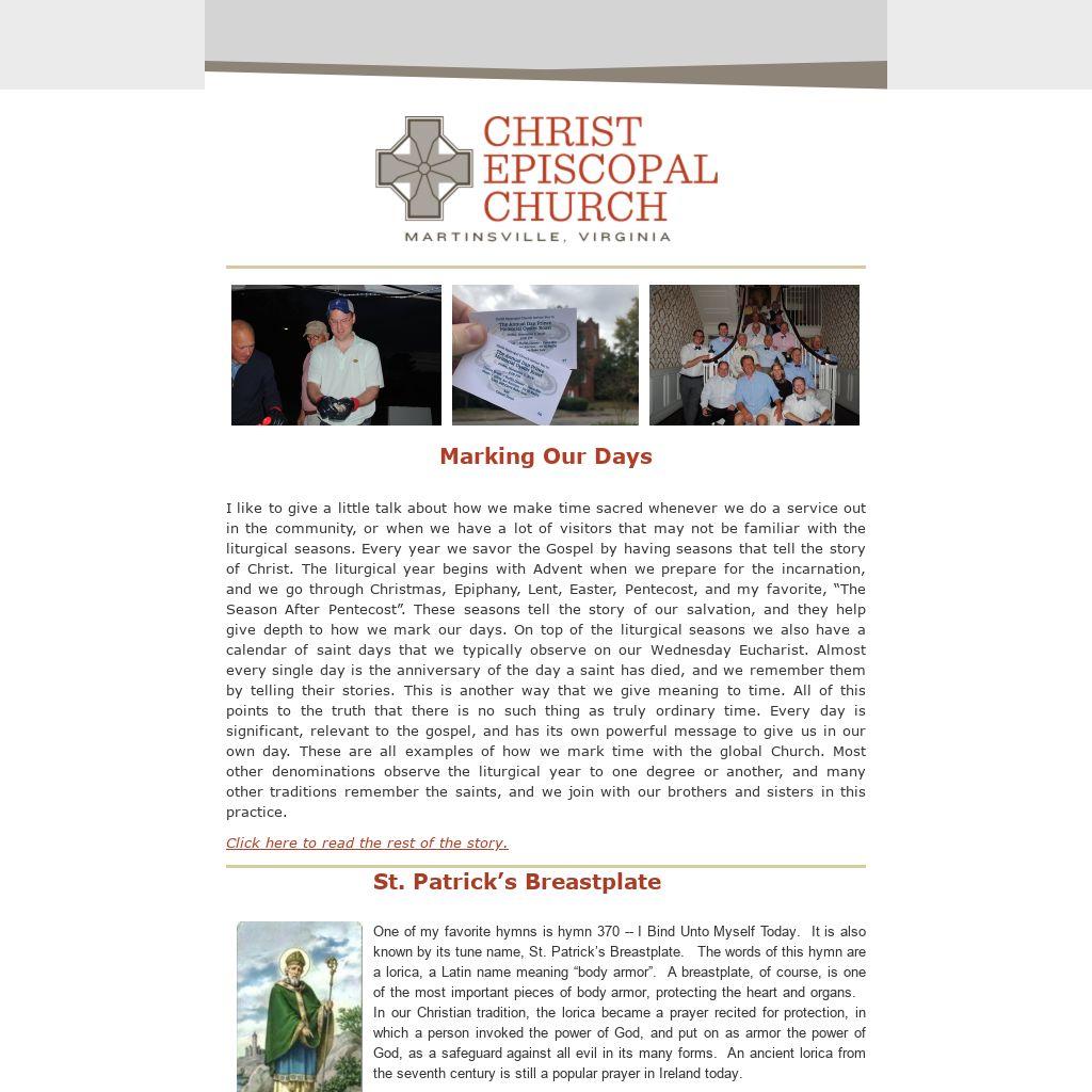 I like to give a little talk about how we make time sacred whenever we do a service out in the community, or when we have a lot of visitors that may not be familiar with the liturgical seasons. Every year we savor the Gospel by having seasons that tell the story of Christ. The liturgical year begins with Advent when we prepare for the incarnation, and we go through Christmas, Epiphany, Lent, Easter, Pentecost, and my favorite, “The Season After Pentecost”. These seasons tell the story of our salvation, and they help give depth to how we mark our days. On top of the liturgical seasons we also have a calendar of saint days that we typically observe on our Wednesday Eucharist. Almost every single day is the anniversary of the day a saint has died, and we remember them by telling their stories. This is another way that we give meaning to time. All of this points to the truth that there is no such thing as truly ordinary time. Every day is significant, relevant to the gospel, and has its own powerful message to give us in our own day. These are all examples of how we mark time with the global Church. Most other denominations observe the liturgical year to one degree or another, and many other traditions remember the saints, and we join with our brothers and sisters in this practice.