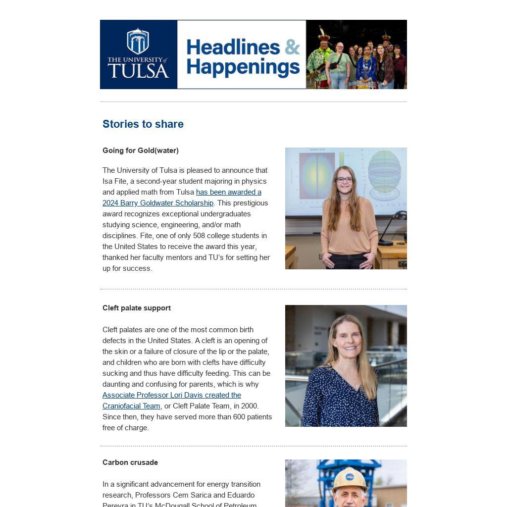 The University of Tulsa is pleased to announce that Isa Fite, a second-year student majoring in physics and applied math from Tulsa has been awarded a 2024 Barry Goldwater Scholarship. This prestigious award recognizes exceptional undergraduates studying science, engineering, and/or math disciplines. Fite, one of only 508 college students in the United States to receive the award this year, thanked her faculty mentors and TU’s for setting her up for success.