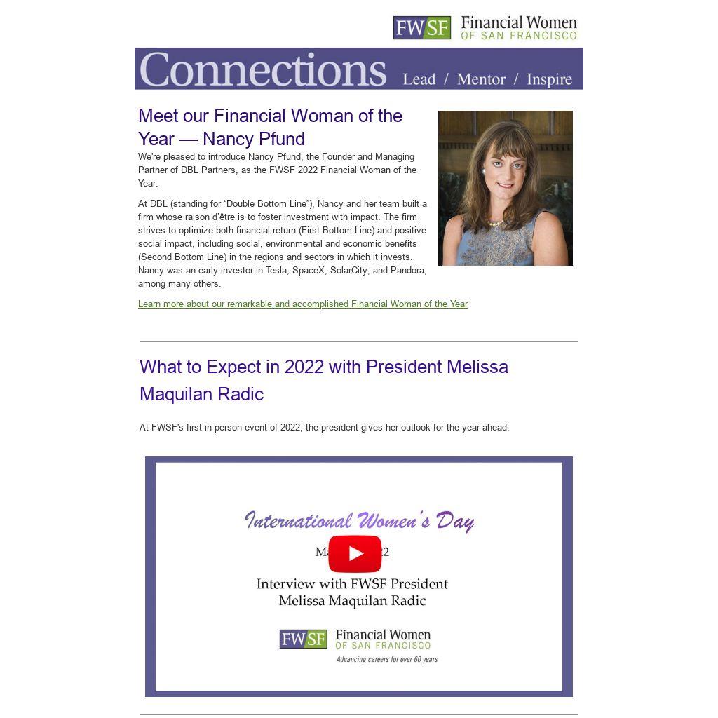 We're pleased to introduce Nancy Pfund, the Founder and Managing Partner of DBL Partners, as the FWSF 2022 Financial Woman of the Year.