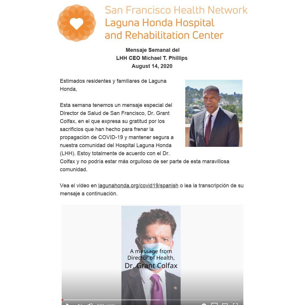 Esta semana tenemos un mensaje especial del Director de Salud de San Francisco, Dr. Grant Colfax, en el que expresa su gratitud por los sacrificios que han hecho para frenar la propagación de COVID-19 y mantener segura a nuestra comunidad del Hospital Laguna Honda (LHH). Estoy totalmente de acuerdo con el Dr. Colfax y no podría estar más orgulloso de ser parte de esta maravillosa comunidad.