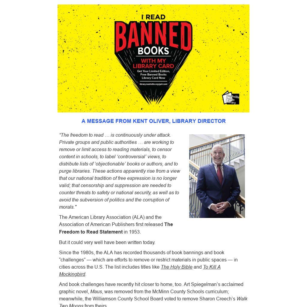 Today, we’re calling on everyone to celebrate intellectual freedom with us, with a free, special edition “Banned Books” Nashville Public Library card.