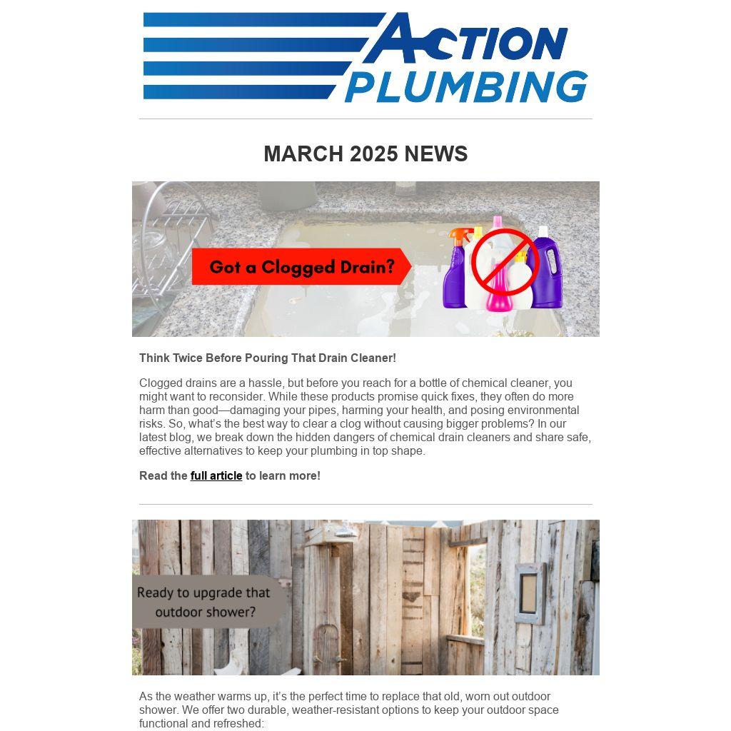 Clogged drain tips, outdoor shower upgrade offer, and more!
