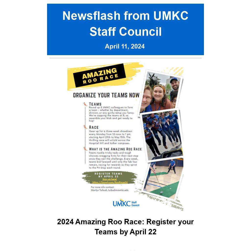 The Amazing Roo Race is back! Are you ready to tackle a mix of brainy puzzles and crazy challenges? If you've seen the TV show "The Amazing Race," gather your group of five colleagues and test your skills and abilities against other UMKC Staff members in a race of wits and speed. Questions? Contact Marilyn Turbush at turbushm@umkc.edu.