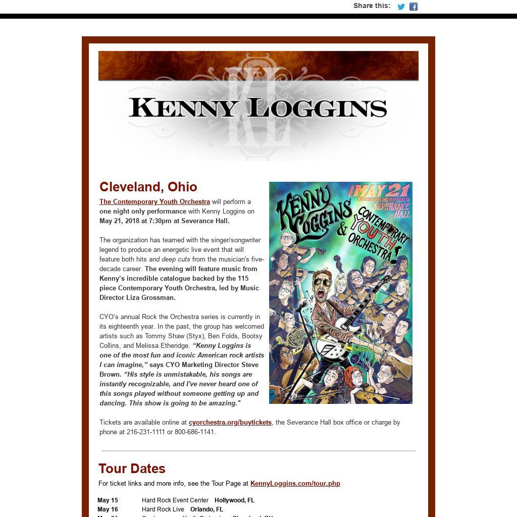 The Contemporary Youth Orchestra will perform a one night only performance with Kenny Loggins on May 21, 2018 at 7:30pm at Severance Hall.