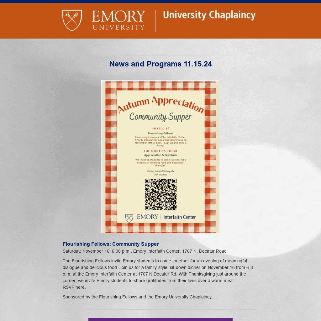 Emory University Chaplaincy ENews is published weekly during term publicizing Atlanta-campus spiritual life programs. It is not a comprehensive listing. For Oxford College spiritual life, please click here. To submit information or to update your preferences, please contact religiouslife@emory.edu.