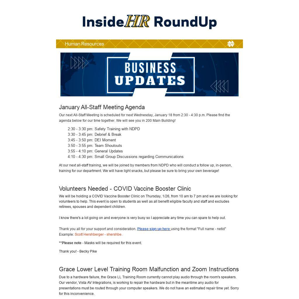 Our next All-Staff Meeting is scheduled for next Wednesday, January 18 from 2:30 - 4:30 p.m. Please find the agenda below for our time together. We will see you in 200 Main Building!