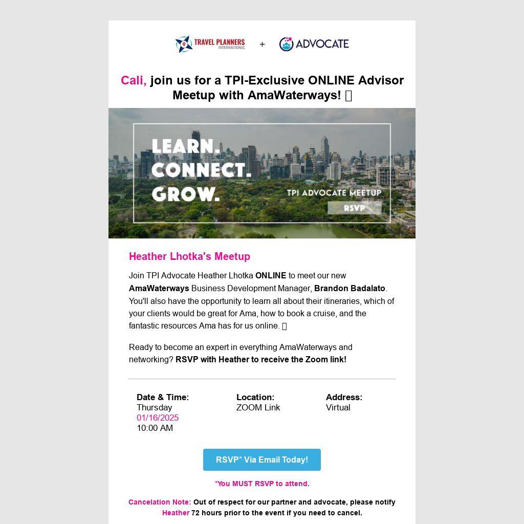 Join TPI Advocate Heather Lhotka ONLINE to meet our new AmaWaterways Business Development Manager, Brandon Badalato. You'll also have the opportunity to learn all about their itineraries, which of your clients would be great for Ama, how to book a cruise, and the fantastic resources Ama has for us online. 💫
