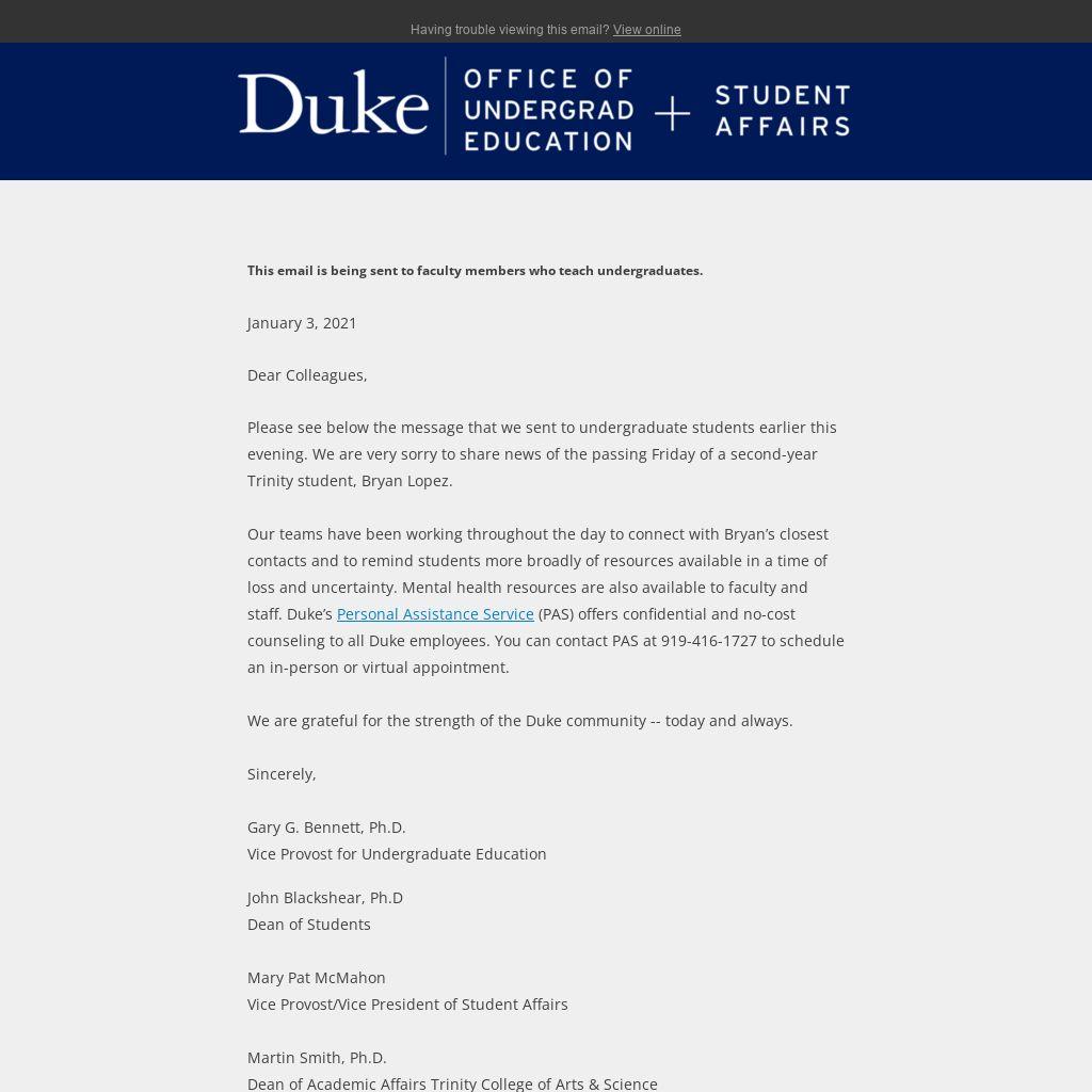 We are thinking today of Bryan’s family, as well as the Wannamaker and West Hall community members, classmates, advisors, faculty, and friends who knew Bryan personally. Bryan’s mother expressed heartfelt appreciation for the Duke community and its care for him during his time here. She stated that Bryan “was loved deeply and will be missed” by all who knew him.