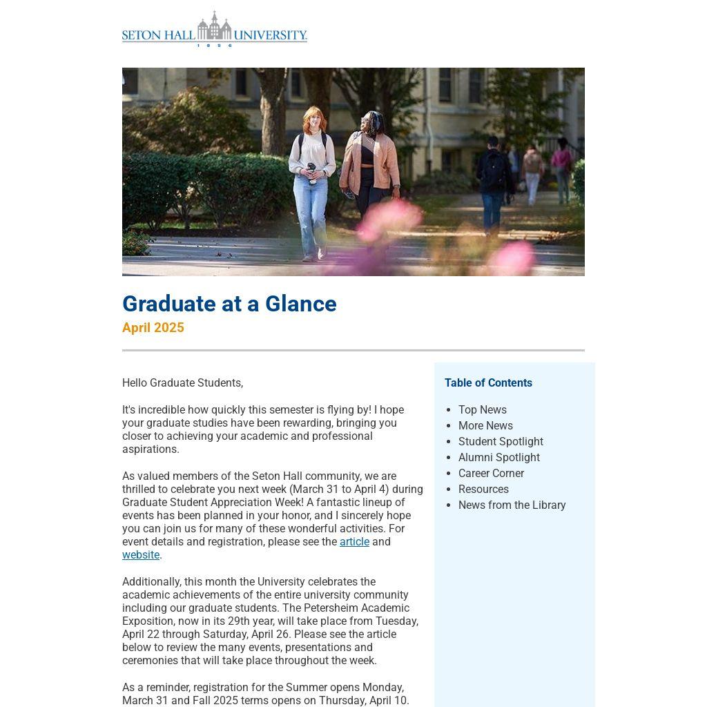 As valued members of the Seton Hall community, we are thrilled to celebrate you next week (March 31 to April 4) during Graduate Student Appreciation Week! A fantastic lineup of events has been planned in your honor, and I sincerely hope you can join us for many of these wonderful activities. For event details and registration, please see the article and website.