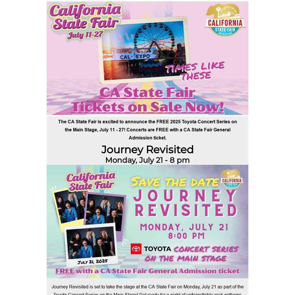 Journey Revisited is set to take the stage at the CA State Fair on Monday, July 21 as part of the Toyota Concert Series on the Main Stage! Get ready for a night of unforgettable rock anthems and classic hits from Journey. The concert is free with general fair admission. Come experience this epic tribute show and make lasting memories at the fair, running from July 11 to 27!