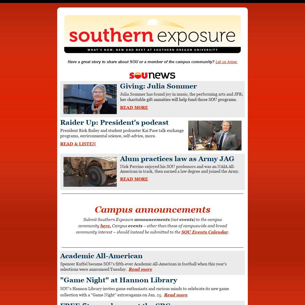 Submit Southern Exposure announcements (not events) to the campus community here. Campus events – other than those of campuswide and broad community interest – should instead be submitted to the SOU Events Calendar.