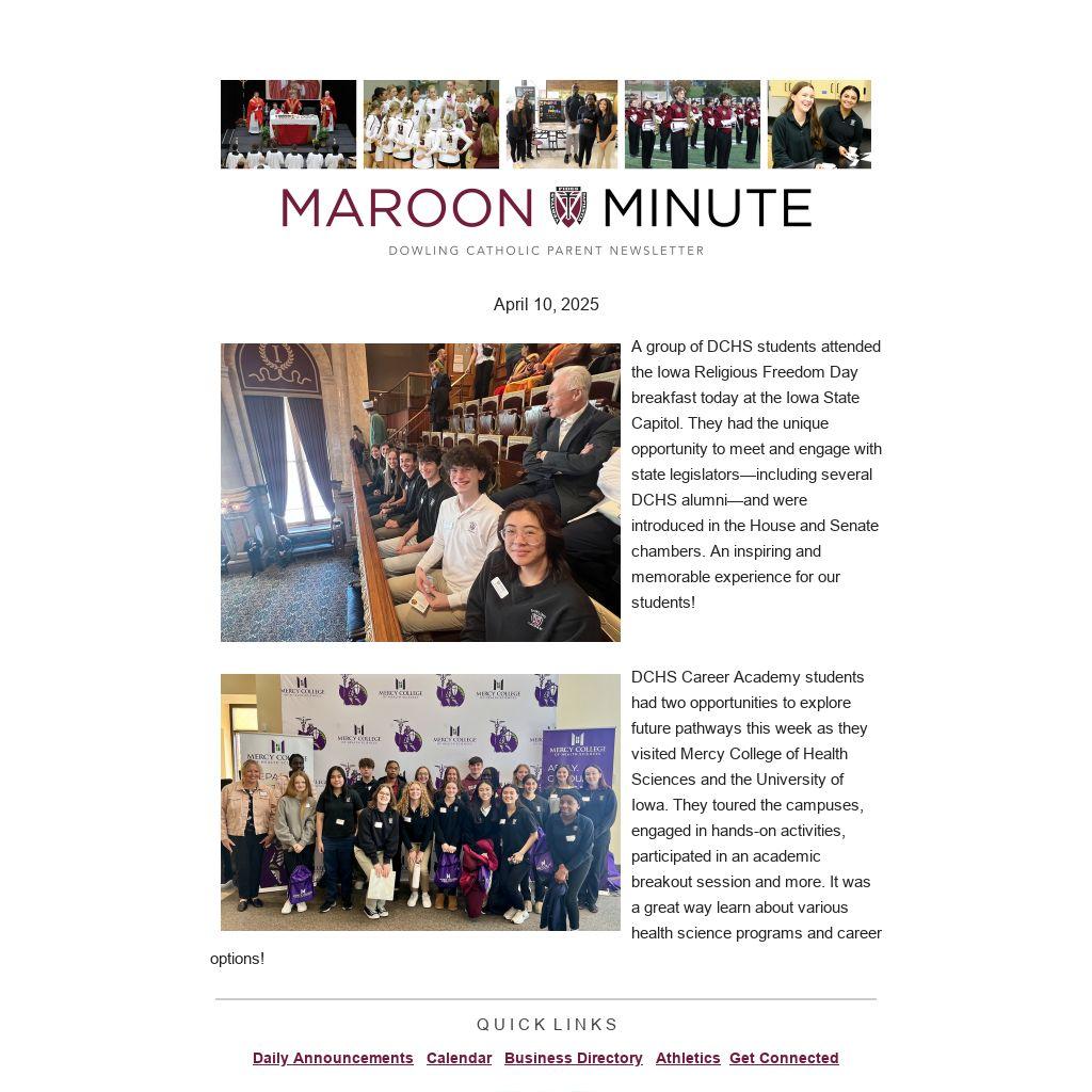 A group of DCHS students attended the Iowa Religious Freedom Day breakfast today at the Iowa State Capitol. They had the unique opportunity to meet and engage with state legislators—including several DCHS alumni—and were introduced in the House and Senate chambers. An inspiring and memorable experience for our students!