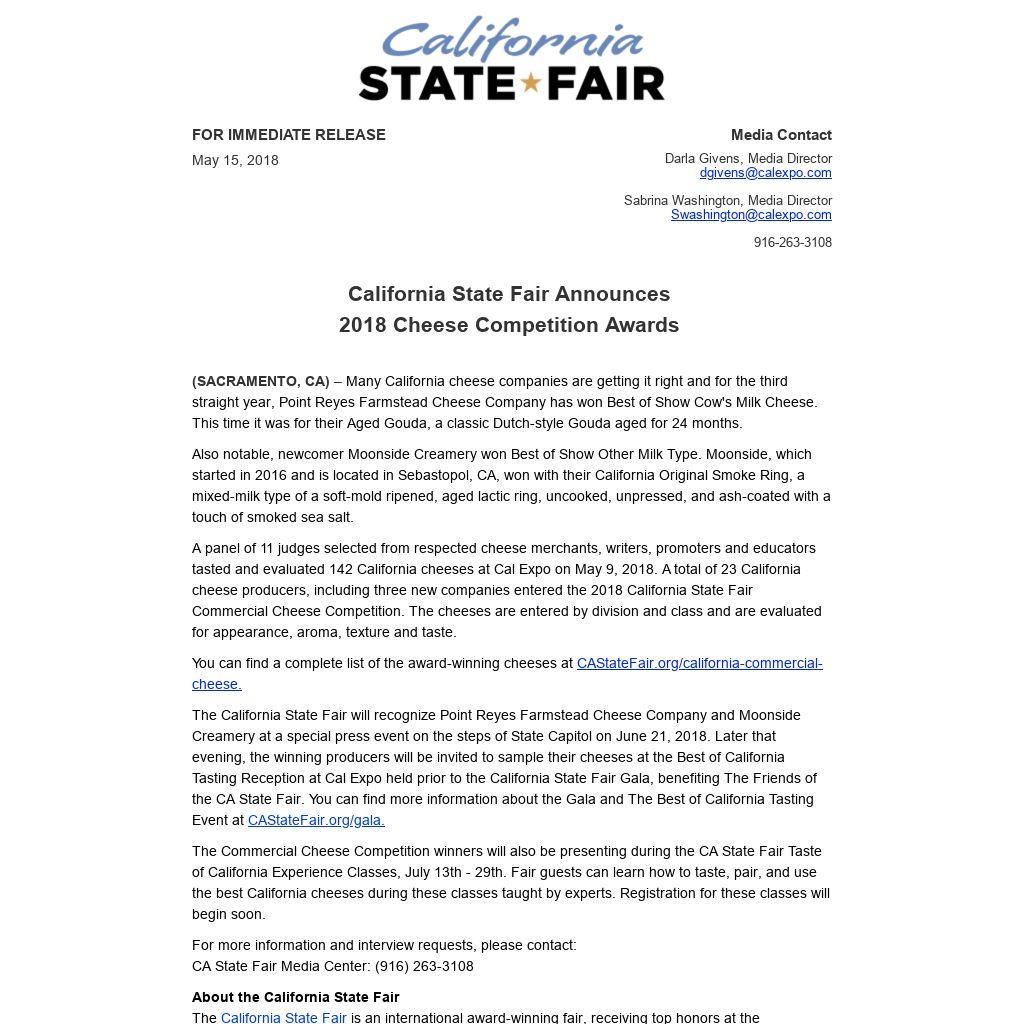 The California State Fair will recognize Point Reyes Farmstead Cheese Company and Moonside Creamery at a special press event on the steps of State Capitol on June 21, 2018. Later that evening, the winning producers will be invited to sample their cheeses at the Best of California Tasting Reception at Cal Expo held prior to the California State Fair Gala, benefiting The Friends of the CA State Fair. You can find more information about the Gala and The Best of California Tasting Event at CAStateFair.org/gala. The Commercial Cheese Competition winners will also be presenting during the CA State Fair Taste of California Experience Classes, July 13th - 29th. Fair guests can learn how to taste, pair, and use the best California cheeses during these classes taught by experts. Registration for these classes will begin soon.