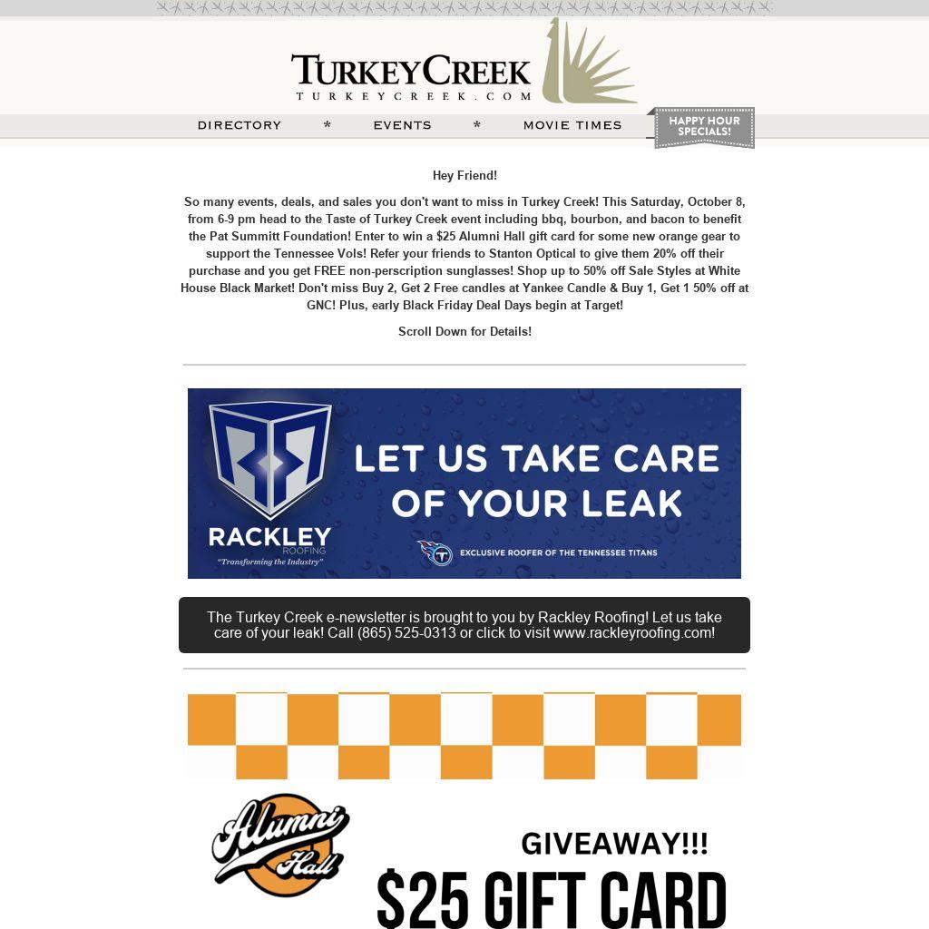 So many events, deals, and sales you don't want to miss in Turkey Creek! This Saturday, October 8, from 6-9 pm head to the Taste of Turkey Creek event including bbq, bourbon, and bacon to benefit the Pat Summitt Foundation! Enter to win a $25 Alumni Hall gift card for some new orange gear to support the Tennessee Vols! Refer your friends to Stanton Optical to give them 20% off their purchase and you get FREE non-perscription sunglasses! Shop up to 50% off Sale Styles at White House Black Market! Don't miss Buy 2, Get 2 Free candles at Yankee Candle & Buy 1, Get 1 50% off at GNC! Plus, early Black Friday Deal Days begin at Target!