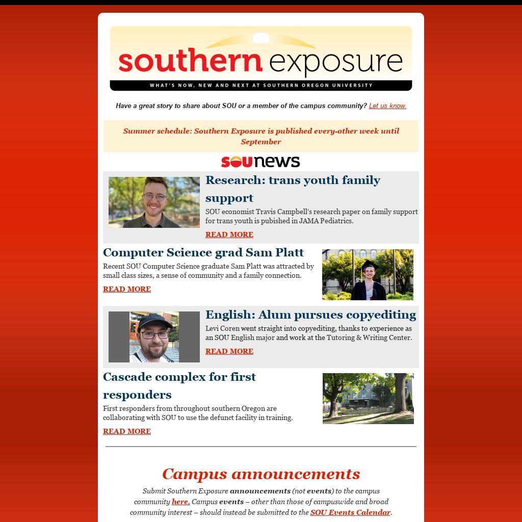 Submit Southern Exposure announcements (not events) to the campus community here. Campus events – other than those of campuswide and broad community interest – should instead be submitted to the SOU Events Calendar.