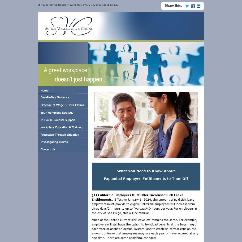 (1) California Employers Must Offer Increased Sick Leave Entitlements. Effective January 1, 2024, the amount of paid sick leave employers must provide to eligible California employees will increase from three days/24 hours to up to five days/40 hours per year. For employers in the city of San Diego, this will be familiar.
