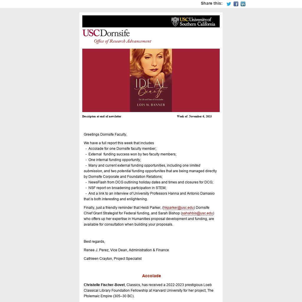 Finally, just a friendly reminder that Heidi Parker, (hkparker@usc.edu) Dornsife Chief Grant Strategist for Federal funding, and Sarah Bishop (sahahbis@usc.edu) who offers up her expertise in Humanities proposal development and funding, are available for consultation when building your proposals.
